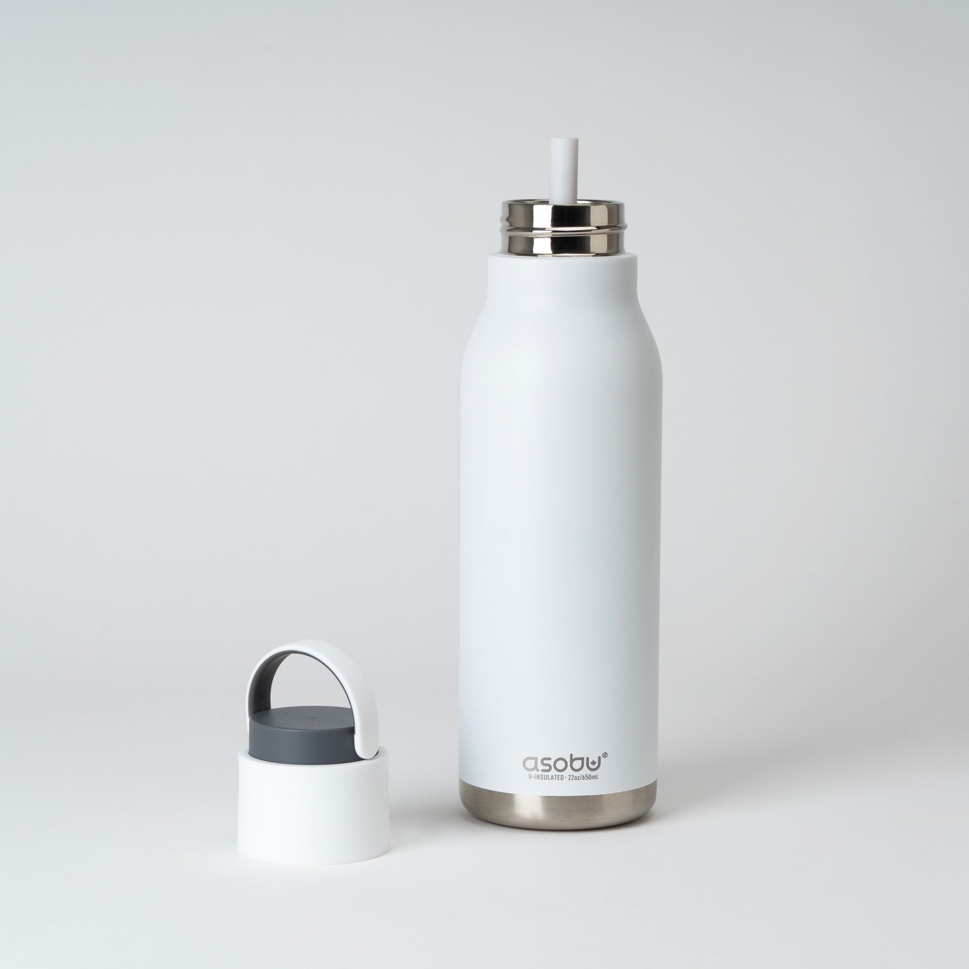 スリムなボディで持ち運びやすいハンドル付きボトル
